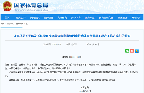 體育總局關于印發《科學有序恢復體育賽事和活動推動體育行業復工復產工作方案》的通知