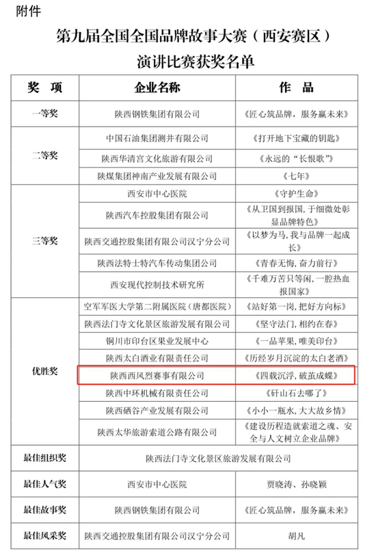 西風烈賽事公司榮獲第九屆全國品牌故事大賽(西安賽區)演講比賽優勝獎