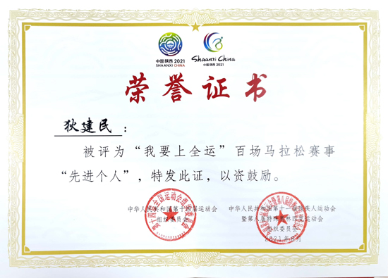 賽事公司董事長(zhǎng)狄建民榮獲“我要上全運(yùn)”百場(chǎng)馬拉松先進(jìn)個(gè)人榮譽(yù)表彰。