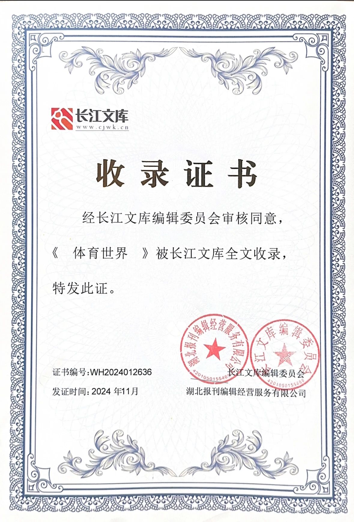 2024年11月,經長江文庫編委會審核同意,《體育世界》正式被長江文庫全文收錄。